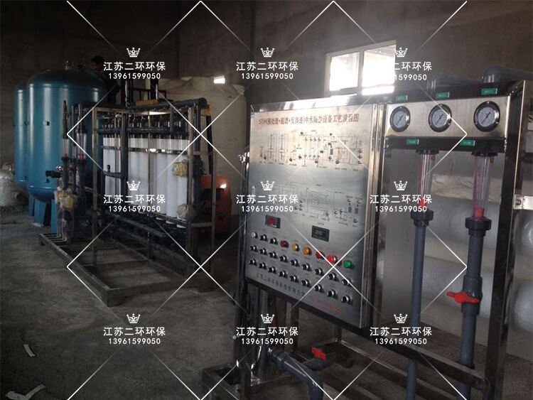 自來水→原水箱→原水泵→機械過濾器(絮凝劑加藥)→活性炭過濾器(阻垢劑加藥)→保安微濾器→高壓泵→反滲透裝置→ 淡水箱→淡水泵→混合柱(11備)→酸堿再生裝置→純水箱→純水泵→用水點