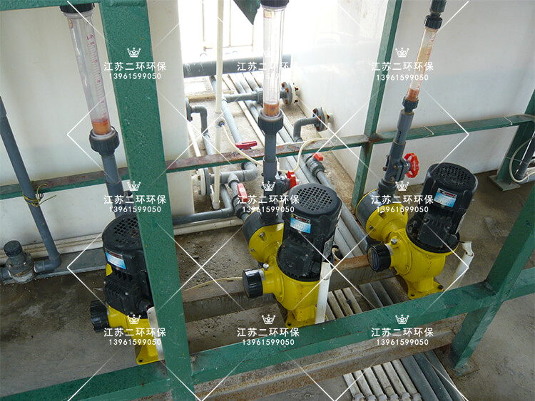 3、一級(jí) pH 調(diào)節(jié):污水由泵進(jìn)入一級(jí)調(diào)節(jié)槽(機(jī)械攪拌),由 pH 自動(dòng)控制儀控制投藥計(jì)量泵投加 NaOH,將廢水的 pH 值調(diào)至工藝設(shè)定值。