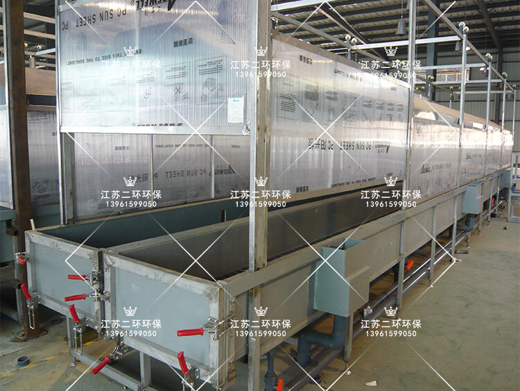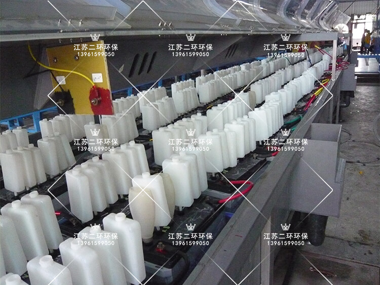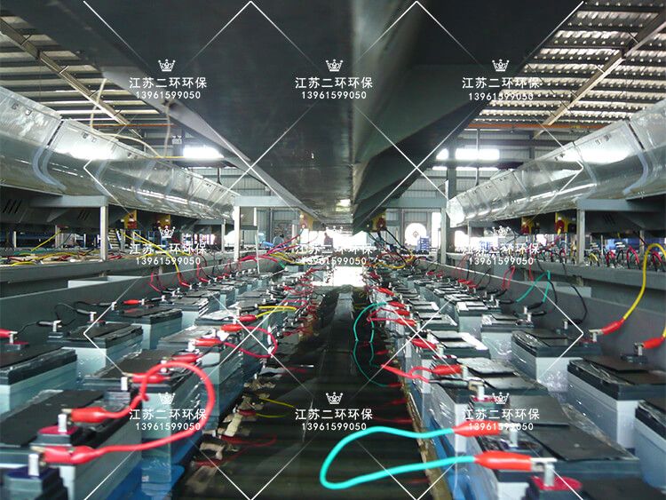 電池化成線,又稱為電池外內(nèi)化成酸霧回收裝置。電池內(nèi)化成充電過程中,加酸通電發(fā)生化學(xué)反應(yīng),生成鉛氧化物活性物質(zhì)。整個(gè)系統(tǒng)有酸槽、酸霧吸罩,酸霧風(fēng)管、酸霧凈化塔構(gòu)成。類似酸洗槽、磷化槽、電解槽裝置。