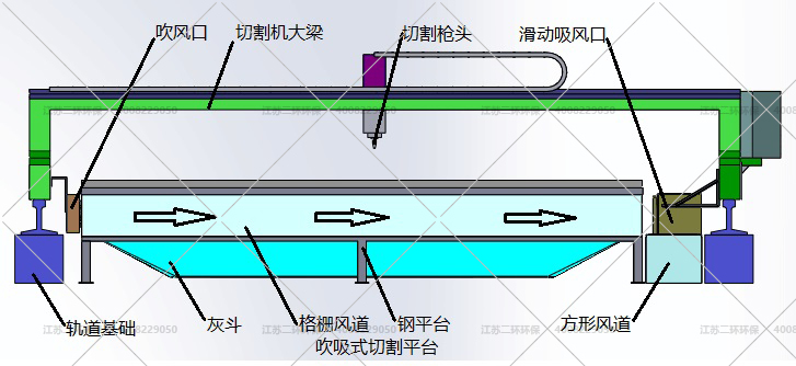 4、移動的行程導(dǎo)軌一側(cè)安裝抽風(fēng)管道,并有相應(yīng)的風(fēng)門調(diào)節(jié),在哪個點切割時,對應(yīng)該點的風(fēng)閥打開,通過管道連接除塵器抽走煙塵。